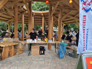 Am 28. Juni fand in Mönchhagen das alljährliche Dorffest statt – bei bestem Wetter. Auch der Feuerwehrverein Mönchhagen beteiligte sich wieder tatkräftig. Der Grill konnte dieses Jahr erstmalig im neuen Pavillon stehen, den die Gemeinde kürzlich anstelle des alten auf dem Festplatz hat errichten lassen. Der neue Pavillon ist mit seiner stabilen Holzkonstruktion ein echter Hingucker, der nicht nur dem Grill und dem Verkaufstresen viel Platz bietet, sondern mit Bänken zum Verweilen einlädt. An dieser Stelle deshalb ein Dank an die Gemeinde – auch für die Organisation des Festes!